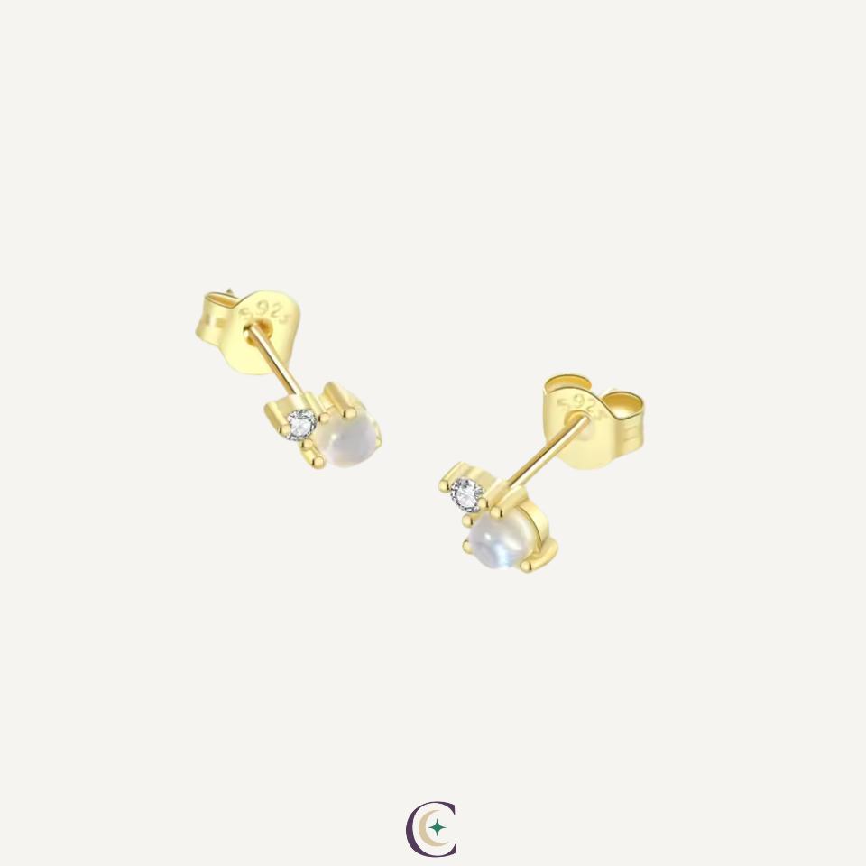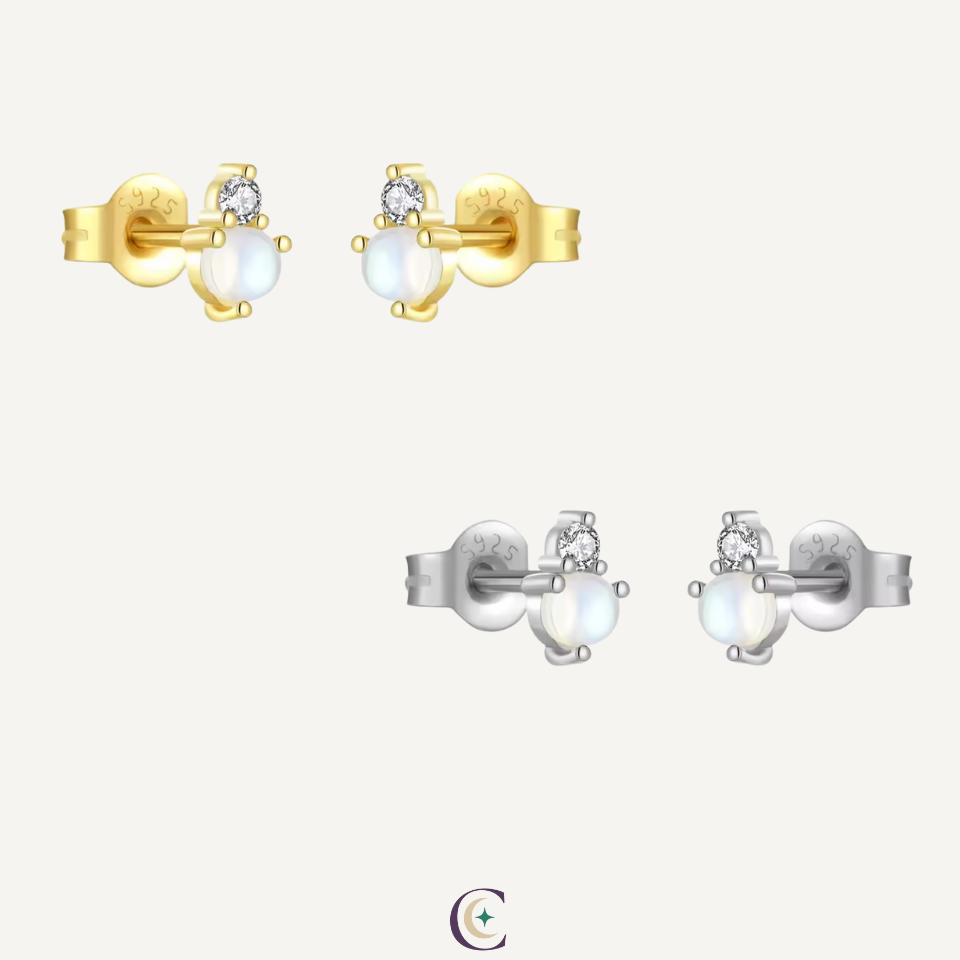 The Lunara Stud glows with quiet elegance — a tribute to the moon’s serene light and intuitive energy. Each earring features a soft white moonstone paired with a fine clear zircon accent, symbolizing emotional balance and inner calm.