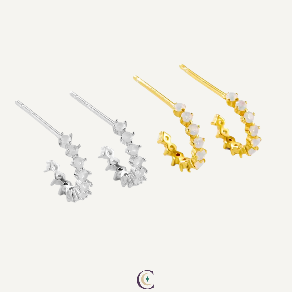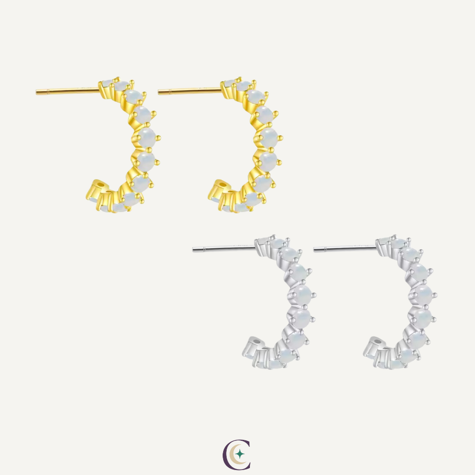 The Lune Hoops are inspired by the tranquil glow of moonlight — a luminous circle of opal zircon that reflects purity, renewal, and gentle harmony. Each piece captures the subtle shimmer of the night sky, designed to bring calm confidence to your everyday rhythm.